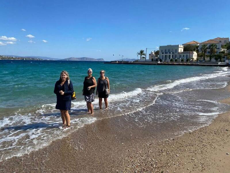 Up at 6:30 to take the ferry to Spetses (Spice Island). It was a half hour group effort with JoAnn, Susan and Carol directing our Nissan Evalia all the way. We got a giant, sweet, greasy thing from a guy on the beach and nobody could stomach the whole thing… JoAnn felt a little sick on board but better toward the end of the three hour cruise…just like Gilligan!